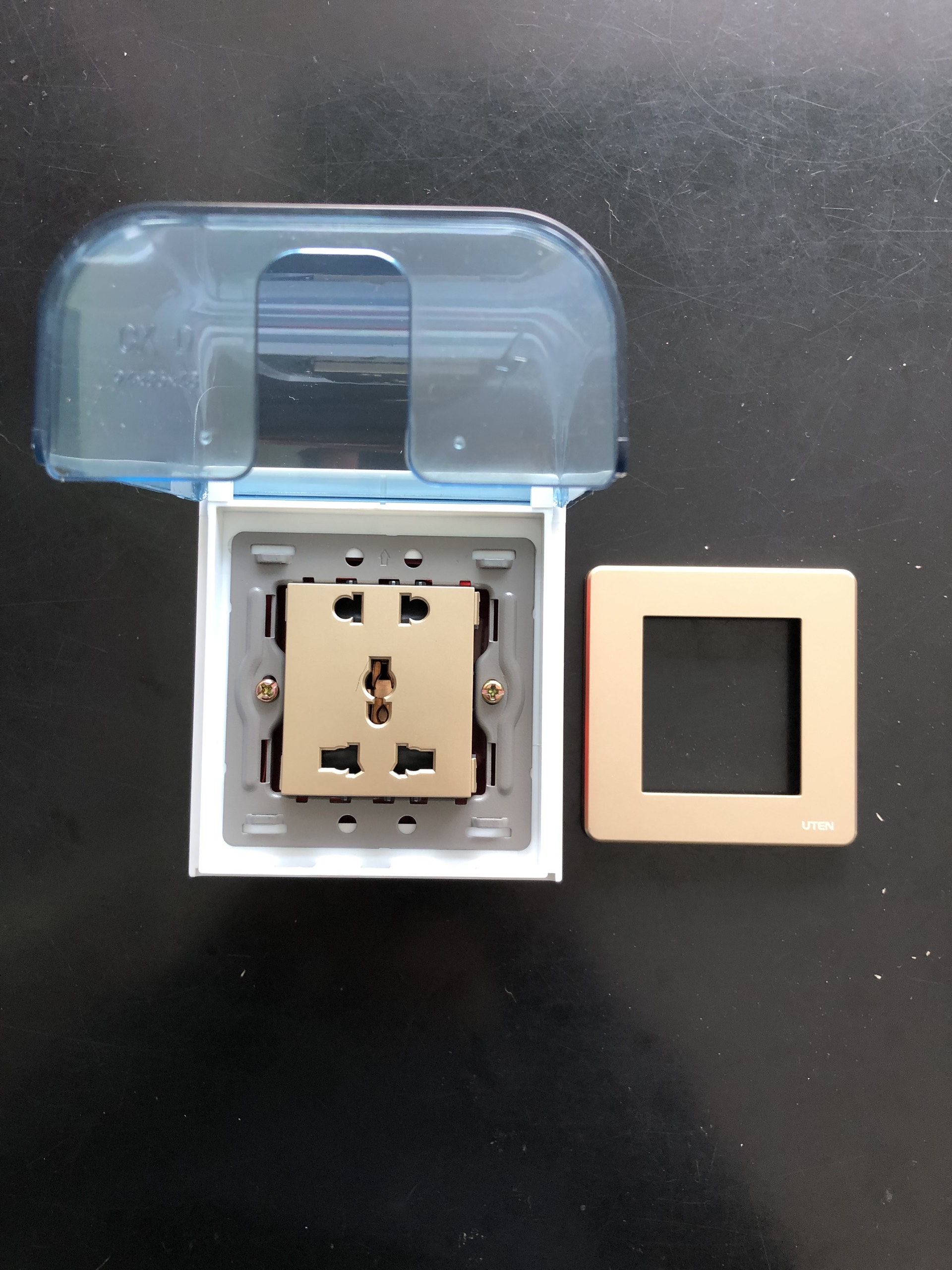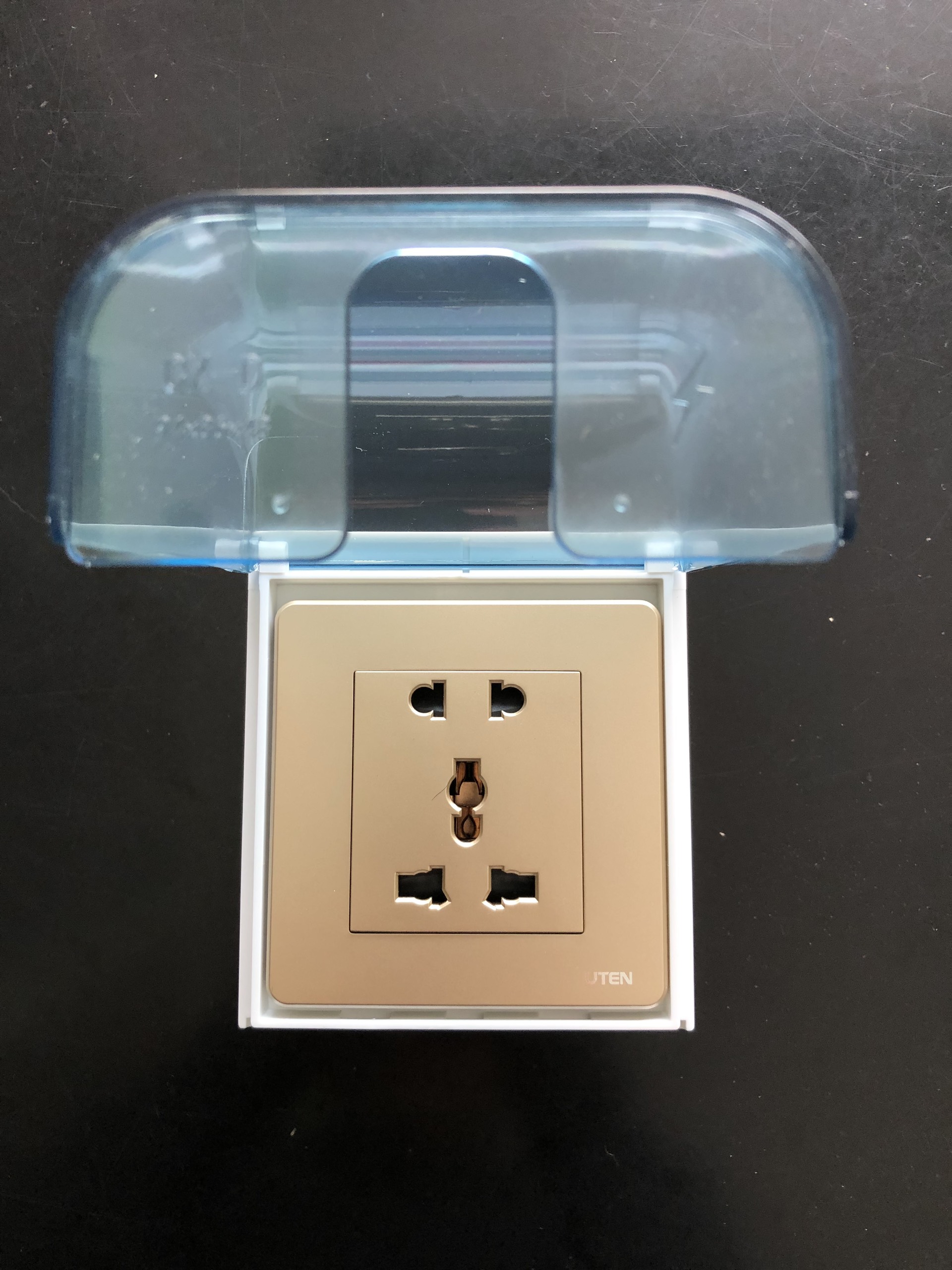 Mặt che nước uten được thiết kế bằng chất liệu ABS cao cấp, độ trong vừa phải giúp dễ dàng phát hiện ổ cắm bên trong. Với thết kế vòng cung vừa đủ để khi cắm điện bằng phích cắm chuẩn thì vẫn có thể đóng nắp mặt che nước, bảo vệ an toàn cho người sử dụng cũng như thiết bị điện trong phòng.